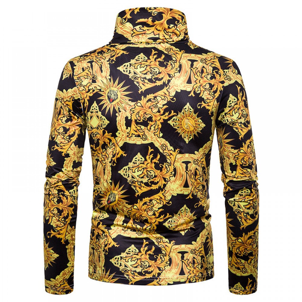 New Men's Large Size 3D Golden Pattern Print High Neck Long Sleeve T-Shirt Bottoming Shirt