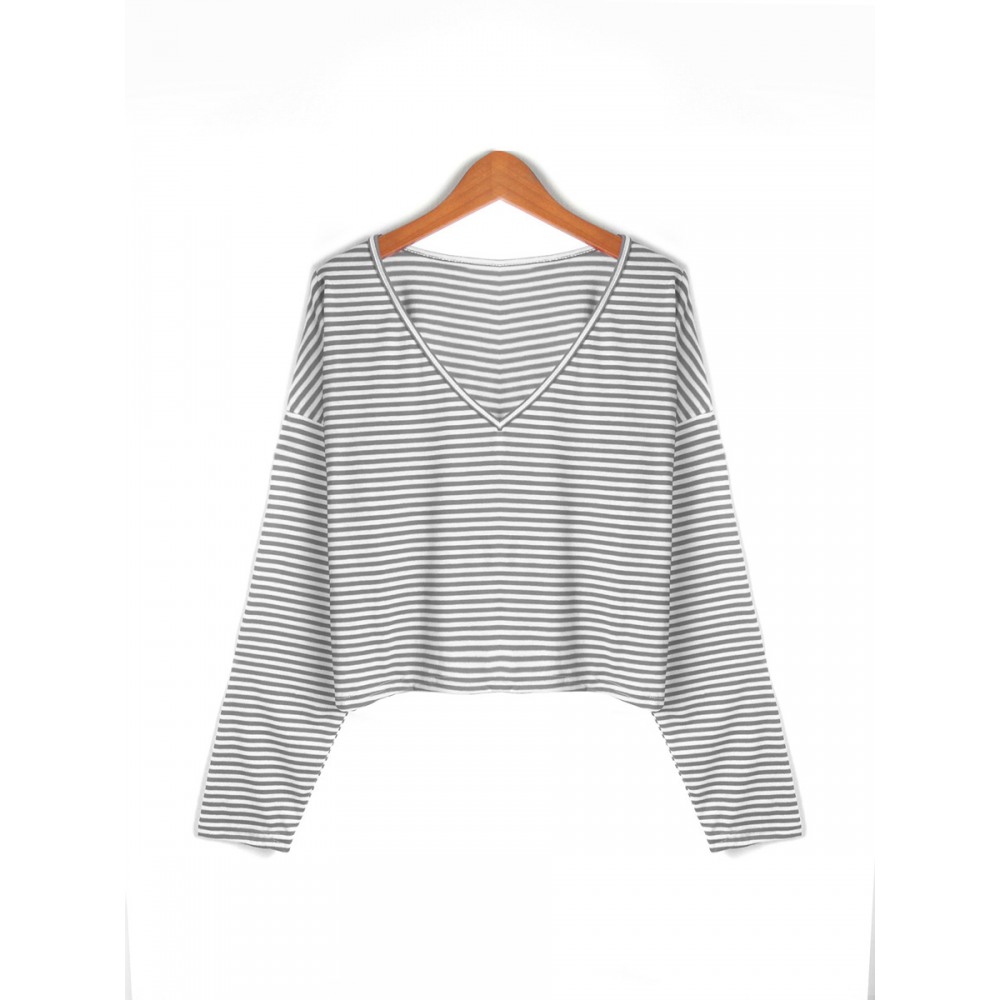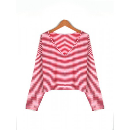 New Style V-Neck Loose Striped Long-Sleeved T-Shirt